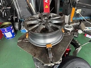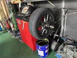 バルブを変えて、ホイール側面を掃除したら、新品タイヤを組付けていきます。